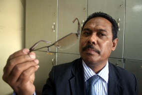 | Eric R Tahalele dengan kacamatanya yang pecah. |